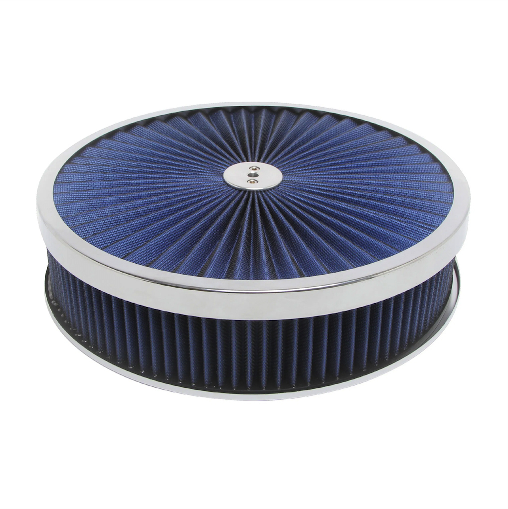 Air Cleaner Assembly – Super Flow – 14 in Diameter – 3 in Tall – 5-1/8 in Carb Flange – Flat Base – Blue Reusable Cotton – Steel – Chrome – Kit