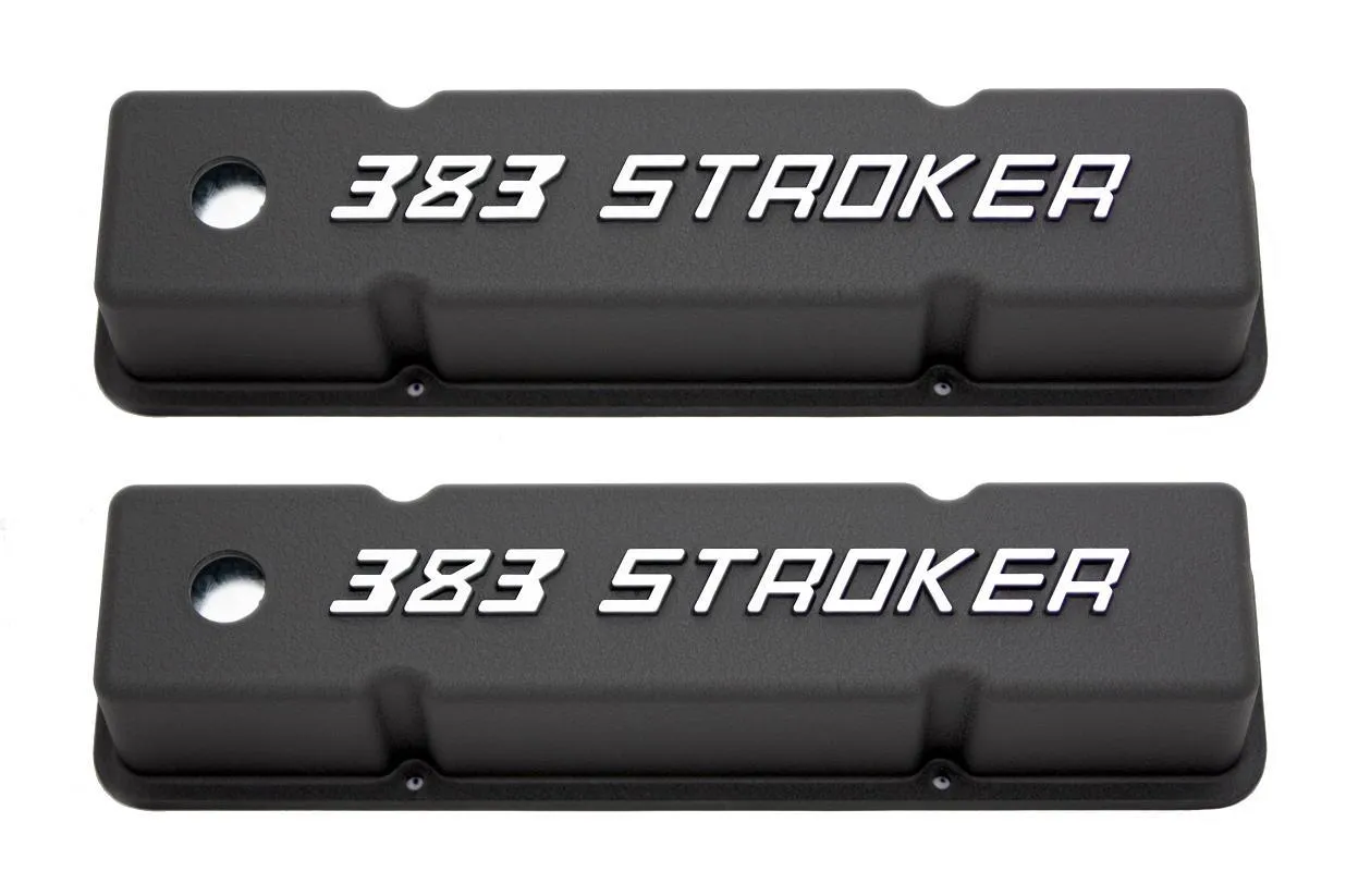 Valve Cover – Tall – 3.875 in Height – Breather Holes – Aluminum – 383 Stroker – Black Powder Coat – Small Block Chevy – Pair