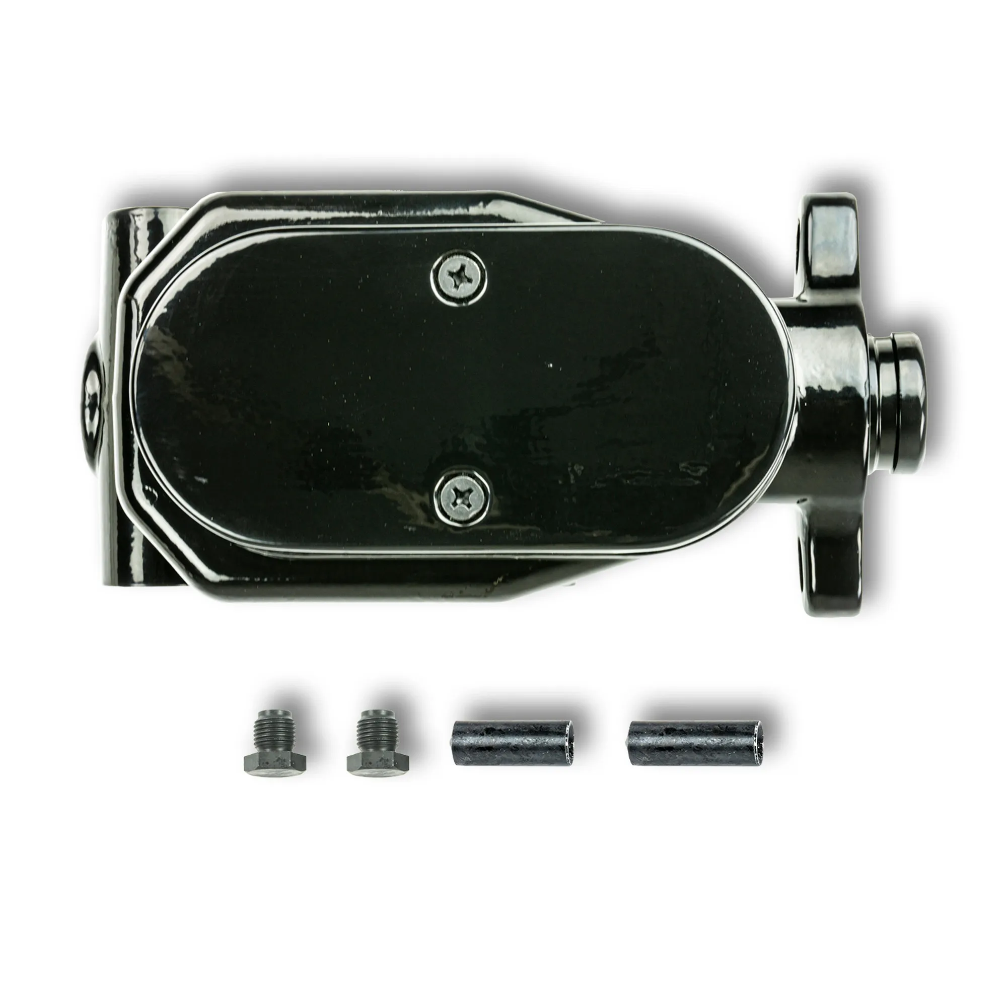 Master Cylinder – 1.125 in Bore – Slimline Style – Dual Integral Reservoir – Aluminum – Black Paint – Various Applications 1958-74 – Kit