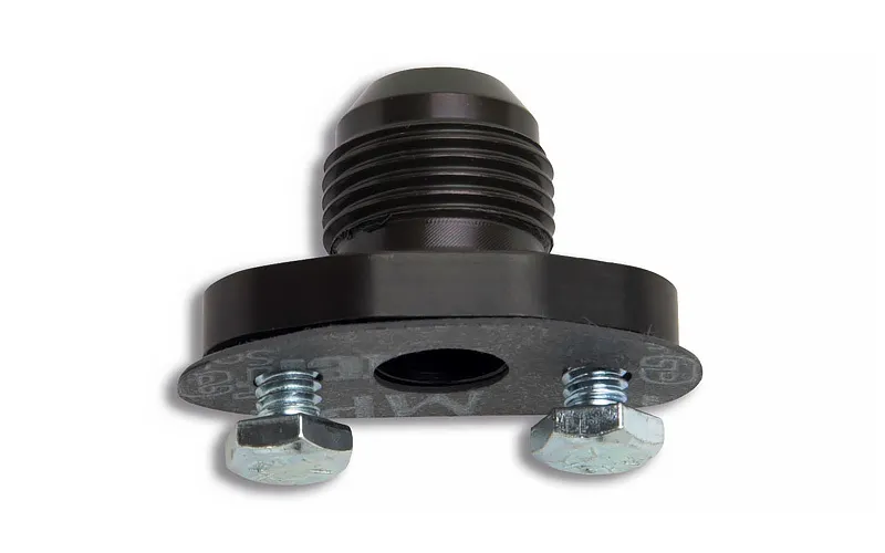 Fitting – Turbo Fitting – Adapter – Straight – Oil Pan Drain Flange to 10 AN Male – Gasket / Bolts Included – Steel – Black Oxide – Each
