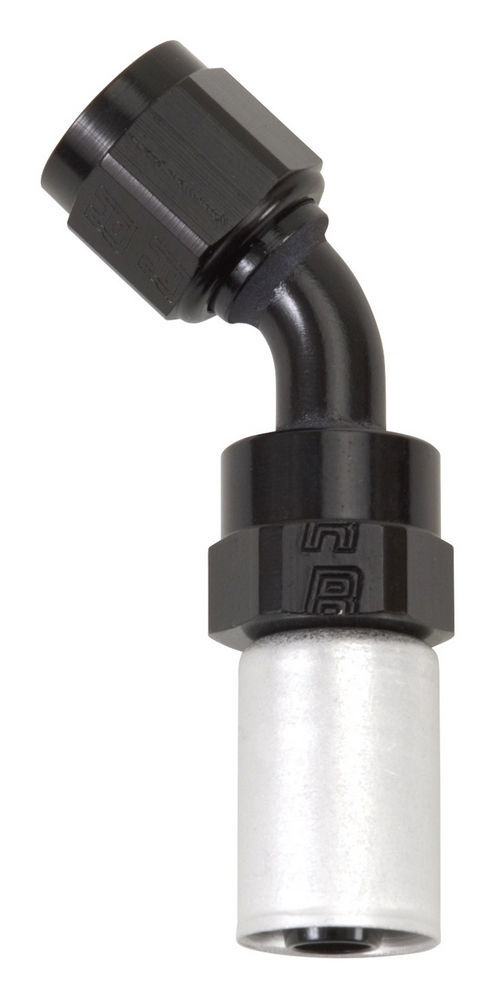 Fitting – Hose End – Crimp-On – 45 Degree – 8 AN Hose Crimp to 8 AN Female – Aluminum – Black / Silver Anodized – Each