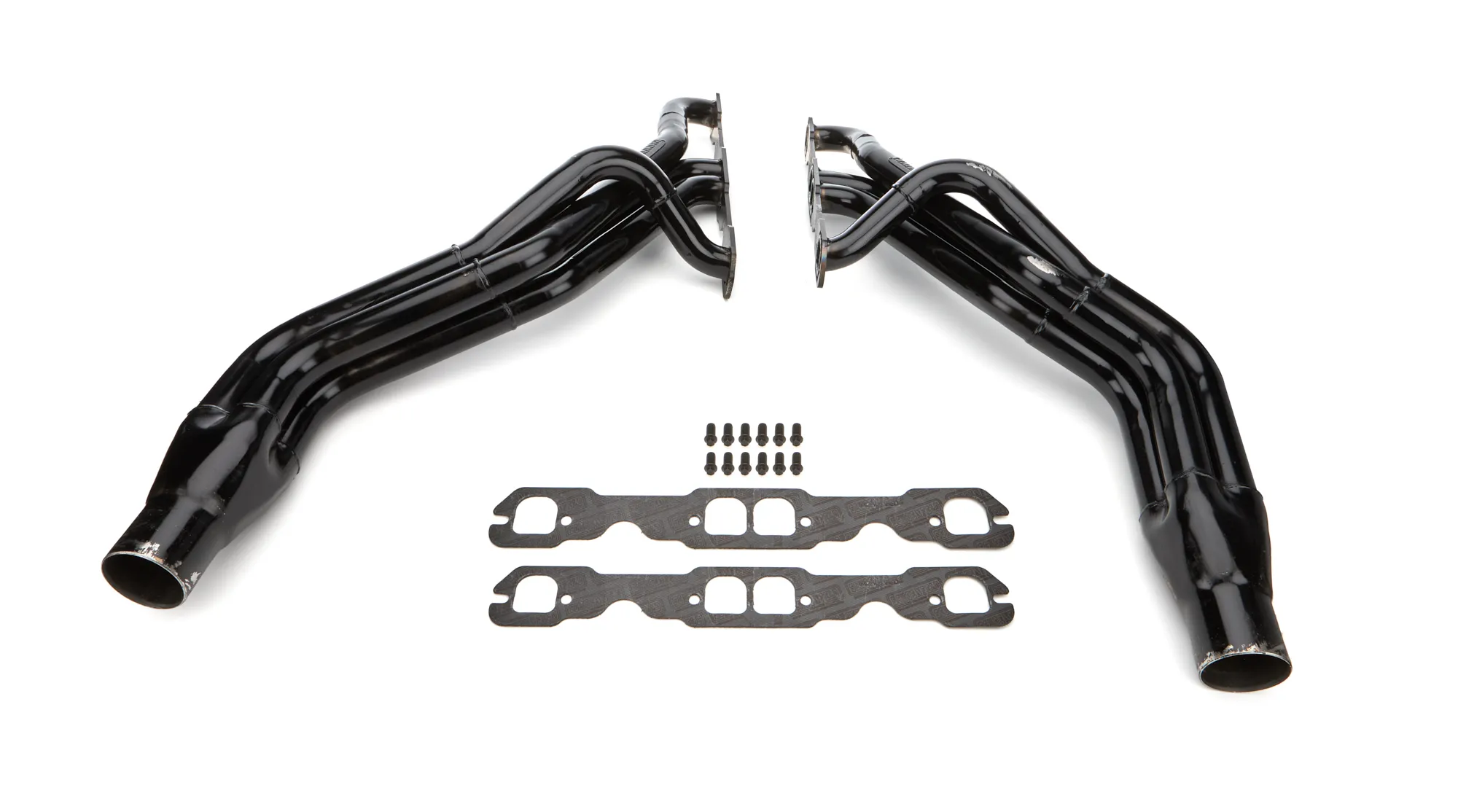 Headers – Stock Clip – 1.625 in to 1.75 in to 1.875 in Primary – 3 in Collector – Gaskets / Hardware Included – Steel – Black Paint – Small Block Chevy – Pair