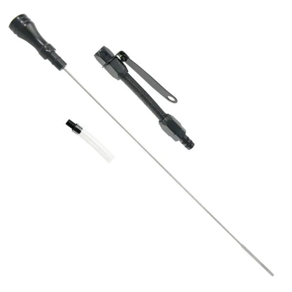 Engine Oil Dipstick – Flexible – Block Mount – Braided Stainless – Aluminum – Black Anodized – Small Block Chevy – Each