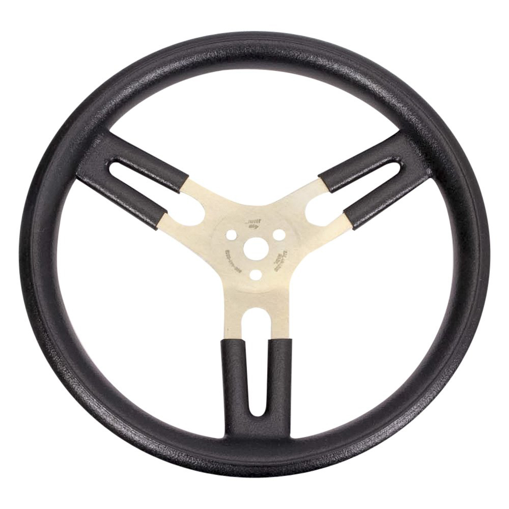 Steering Wheel – 16 in Diameter – Flat – 3-Spoke – Black Rubberized Grip – Aluminum – Brushed – Each