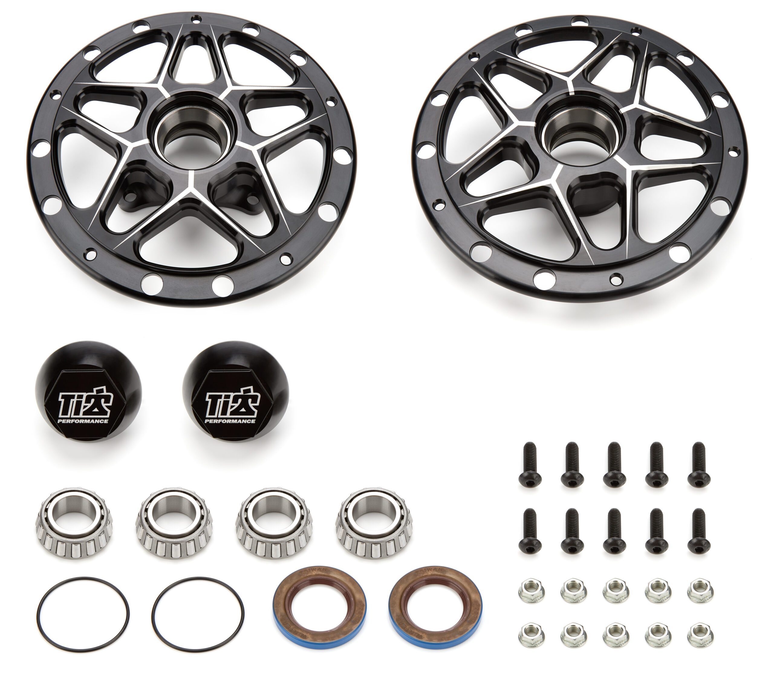Wheel Hub – Front – 2 Direct Mount Hubs – Bearings / Dust Cap / Nuts / Races / Seals / Wheel Studs Included – Aluminum – Black Anodized – Pair