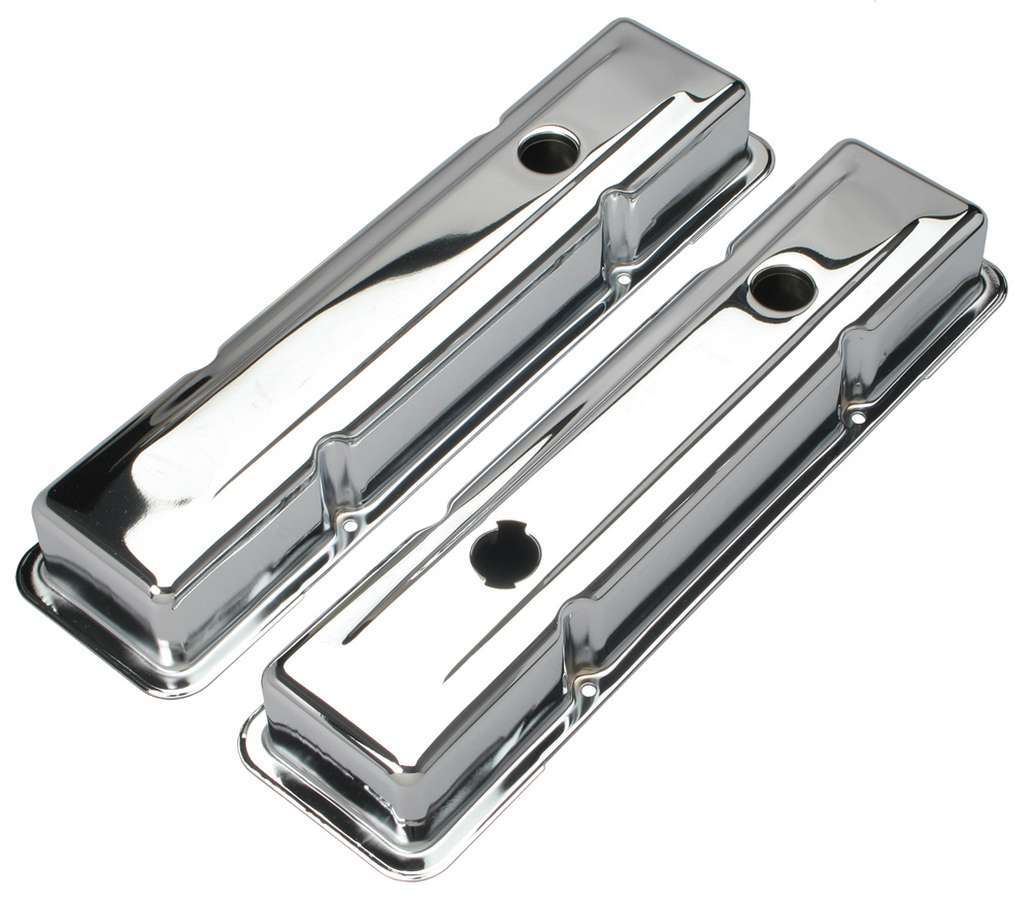 Valve Cover – Stock Height – Baffled – Breather Holes – Steel – Chrome – Small Block Chevy – Pair