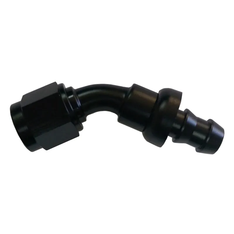 Fitting – Hose End – 45 Degree – 4 AN Hose Barb to 4 AN Female – Aluminum – Black Anodized – Each