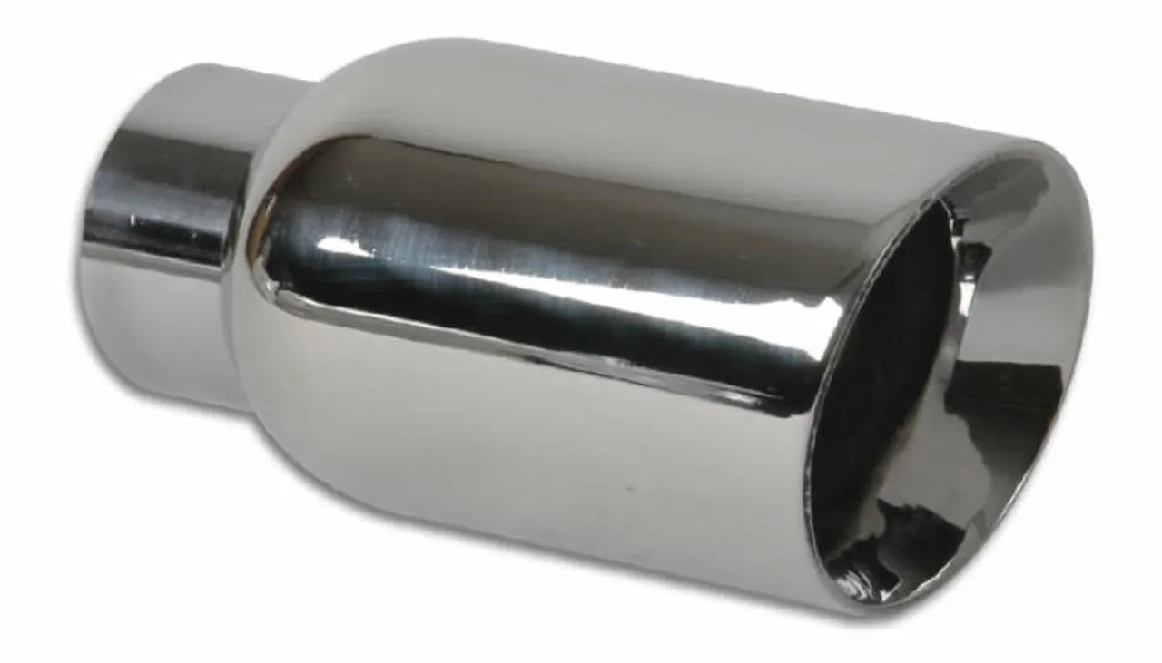 Exhaust Tip – Weld-On – 3 in Inlet – 4 in Round Outlet – 7-3/4 in Long – Double Wall – Beveled Edge – Angled Cut – Stainless – Polished – Each