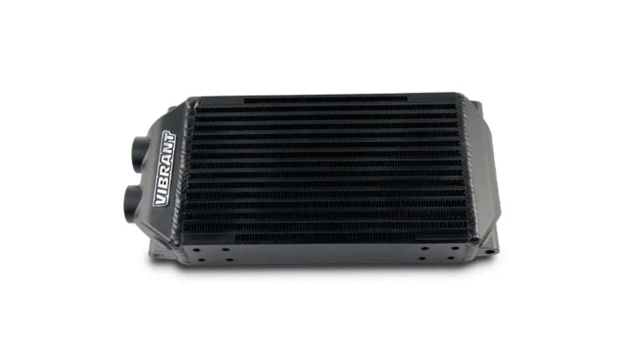 Fluid Cooler – Dual Pass – 10 x 6 x 2 in – Plate and Fin Type – 12 AN Female O-Ring Inlet / Outlet – Aluminum – Black Paint – Each