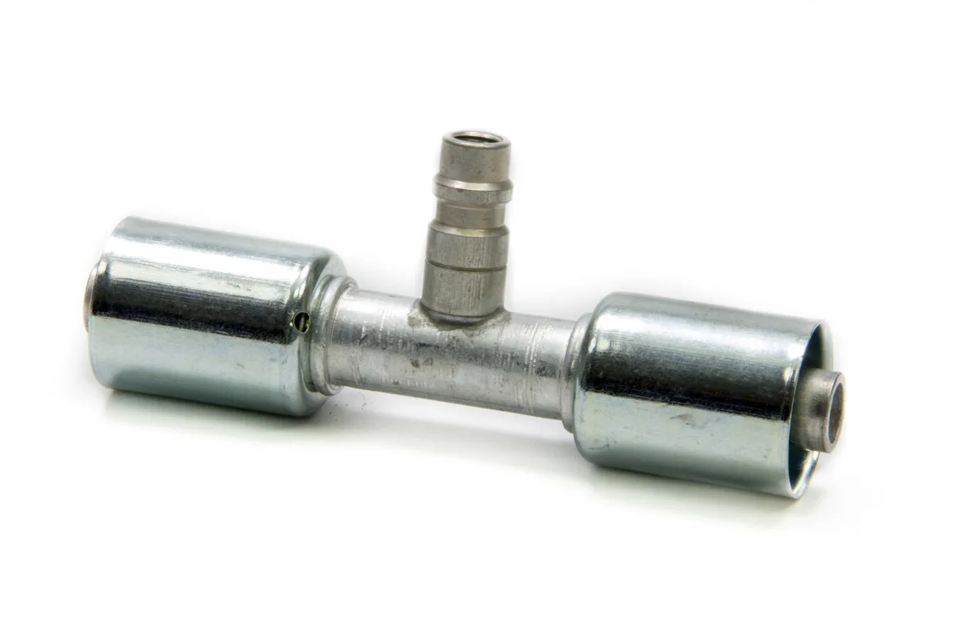 Fitting – Hose End – AC Refrigerant – Straight – 10 AN Hose Crimp to 10 AN Hose Crimp – Charge Port – Aluminum / Steel – Natural / Zinc Oxide – Each