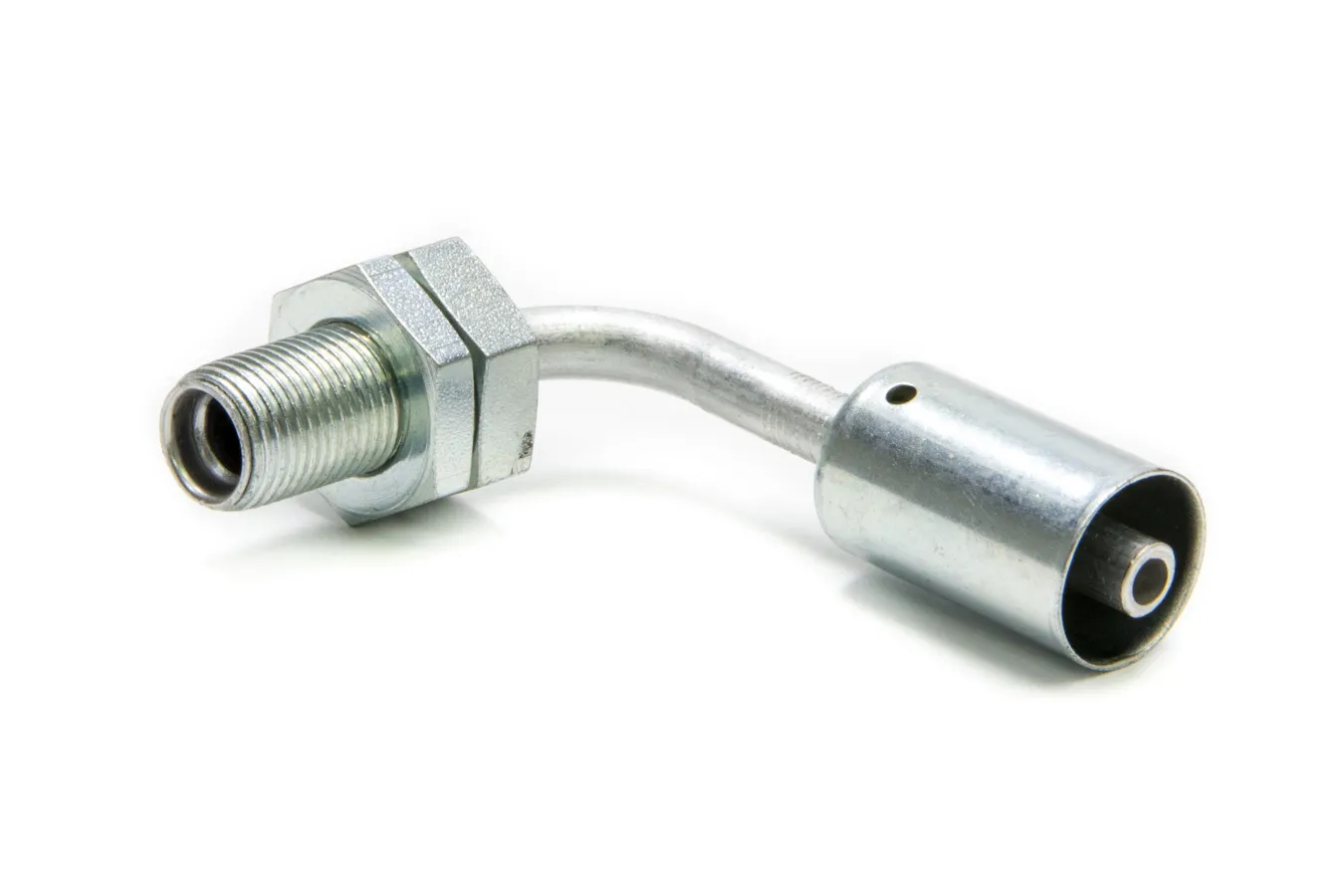 Fitting – Bulkhead – AC Refrigerant – 90 Degree – 6 AN Hose Crimp to 6 AN Male O-Ring Bulkhead – Aluminum / Steel – Natural / Zinc Oxide – Each