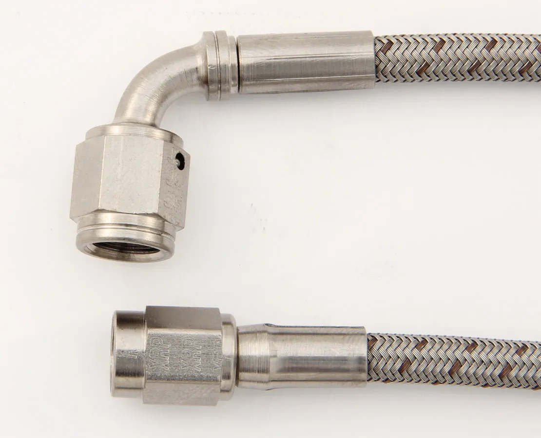 Brake Hose – 12 in Long – 3 AN Hose – 3 AN Straight Female to 3 AN 90 Degree Female – Braided Stainless – PTFE Lined – Each
