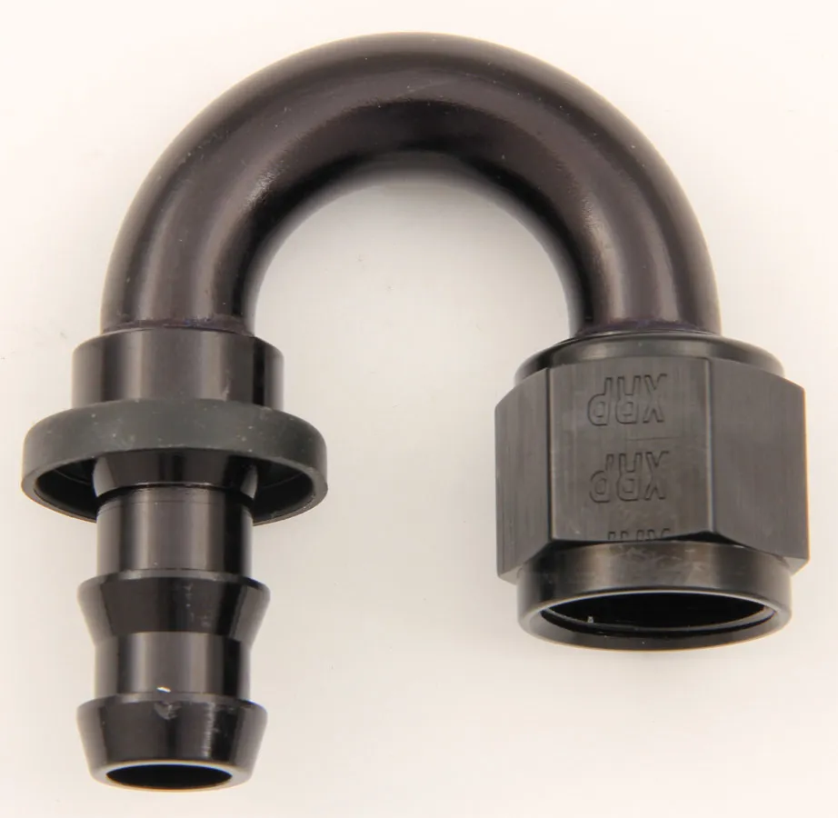 Fitting – Hose End – Push-On – 180 Degree – 8 AN Hose Barb to 8 AN Female – Aluminum – Black Anodized – Each