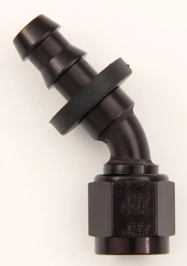 Fitting – Hose End – Push-On – 45 Degree – 8 AN Hose Barb to 8 AN Female – Aluminum – Black Anodized – Each